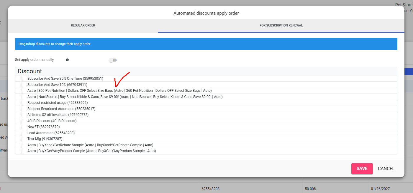 - Reorder them in the Subscription Discount Order settings so the first-order discount is evaluated first.