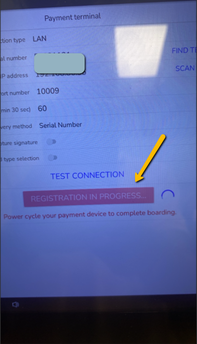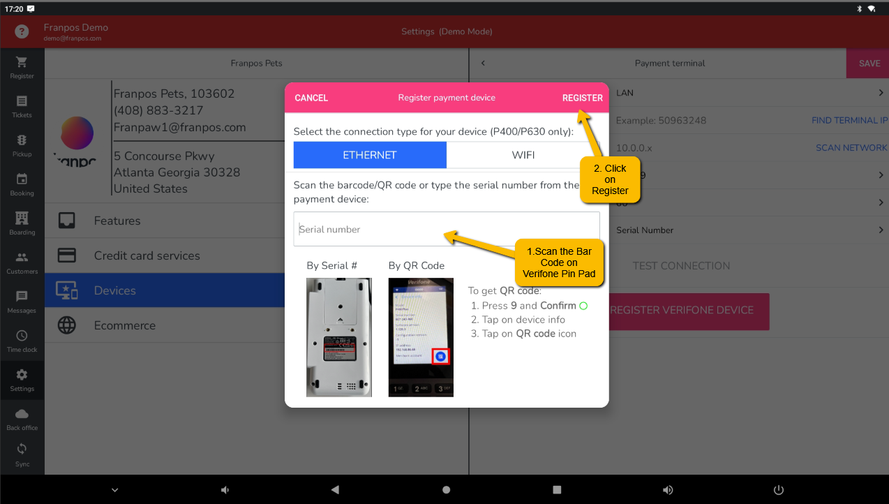 1.3 Tap the 'Register Verifone Device' button in the popup, then either scan the barcode or enter the SN from the payment device as shown below: