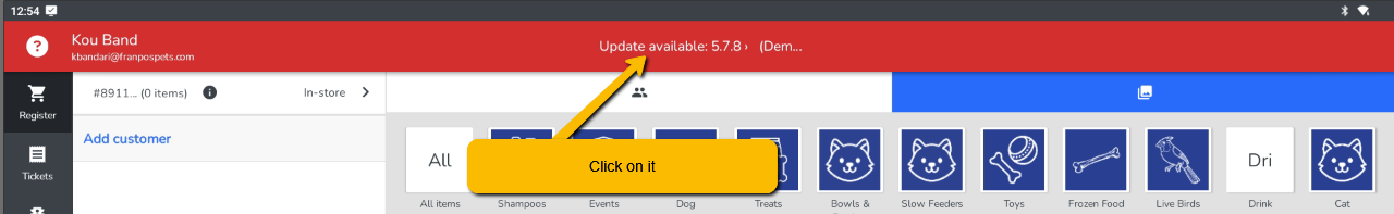1.1 Make sure you are using the latest version of the Franpos Register app. If you don't see the notification "Update available" shown in the image below, it means the POS device is already running the latest version of Register and you are good to move on to the next step in the article.