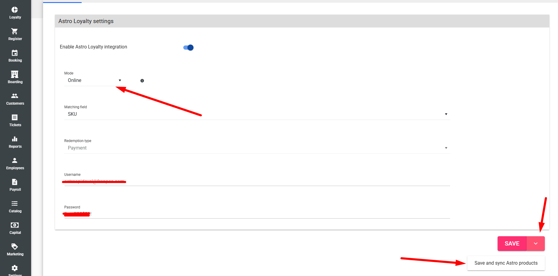 3. Switch the Mode toggle to Online, then click the dropdown arrow and select Save and Sync Astro Products.