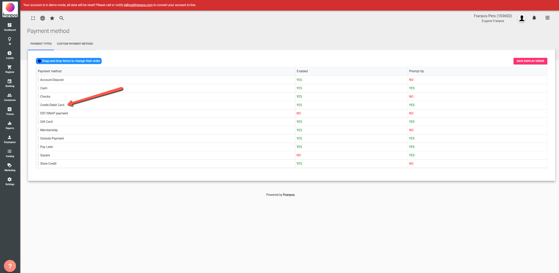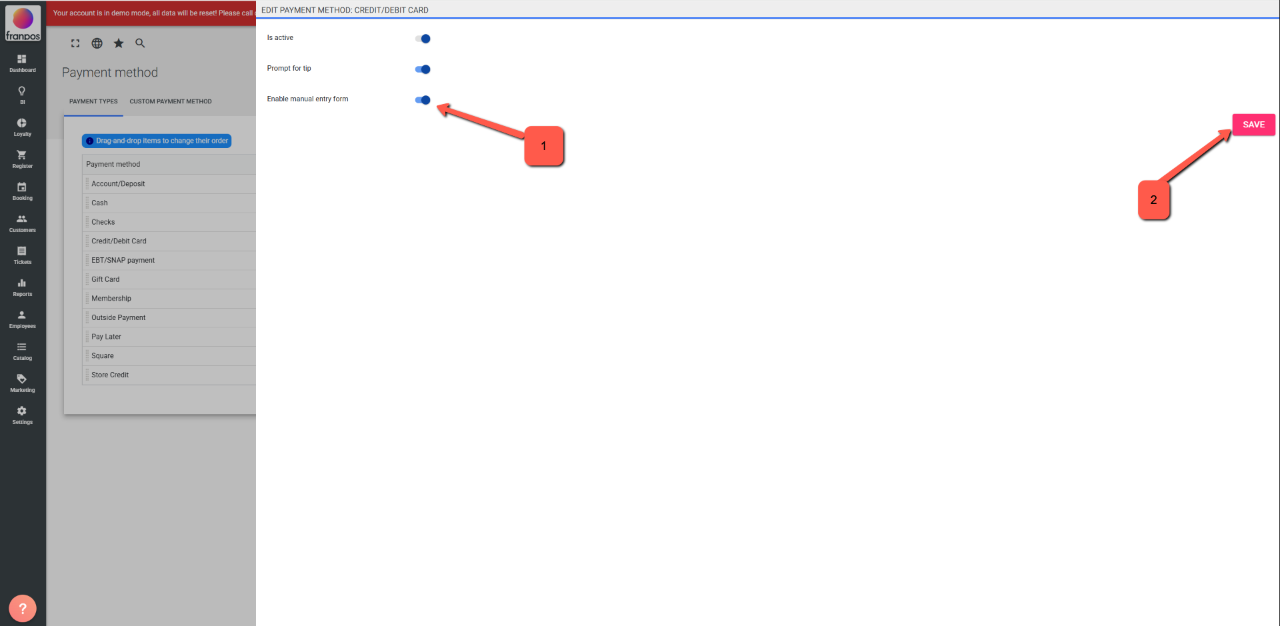 To ensure that Manual Entry is available and enabled for your account, log in to the Franpos Back Office, then navigate to: