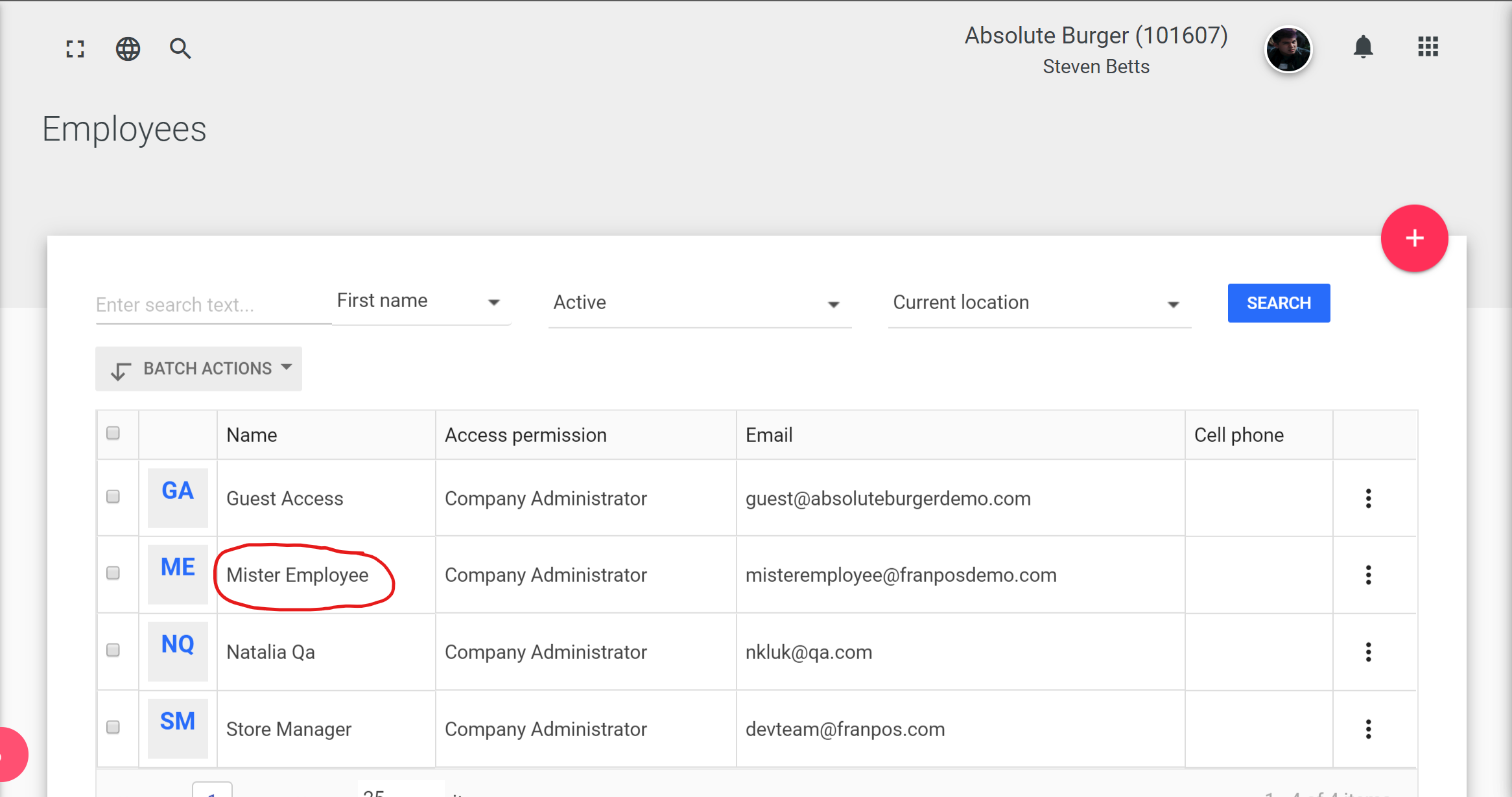 In any case, it is possible to move an employee from one location to another location using batch actions. First, ensure that your own user profile has the necessary permissions to be able to perform this task. "Company Administrators" with access to multiple stores will always have this capability.