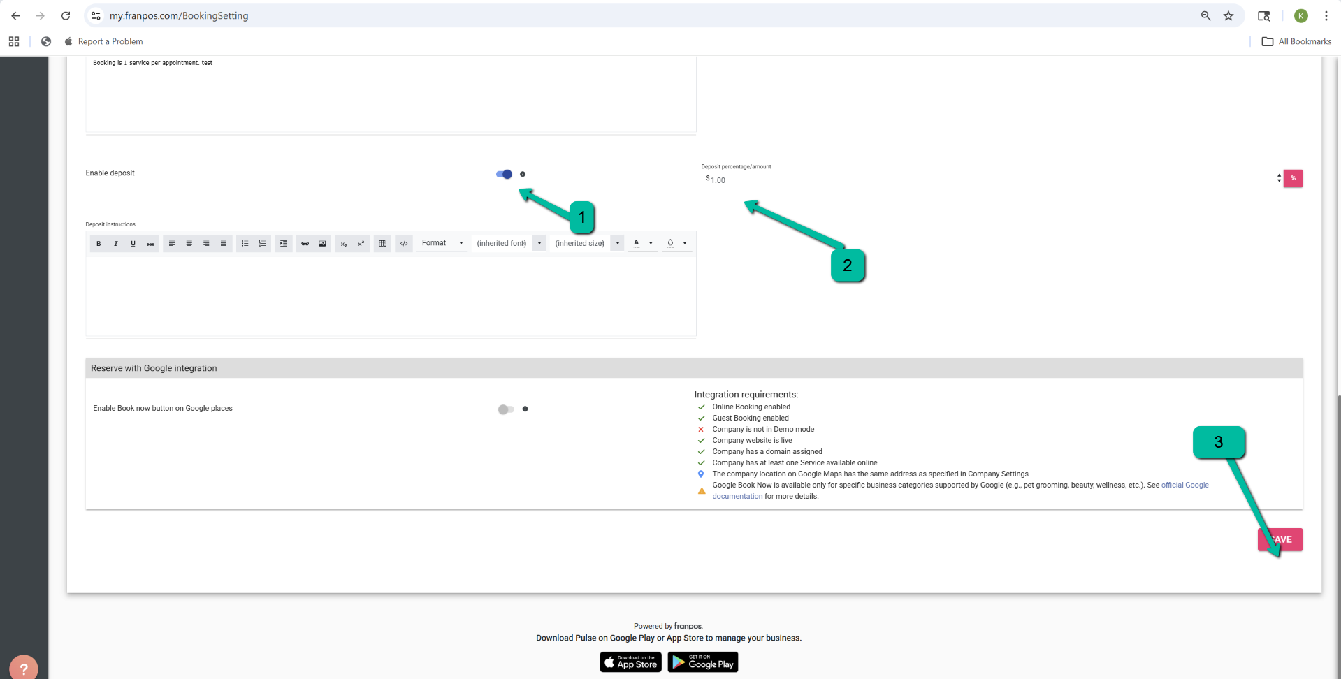 To require customers to pay a deposit when booking an appointment online, a toggle must be enabled and configured in the back office.