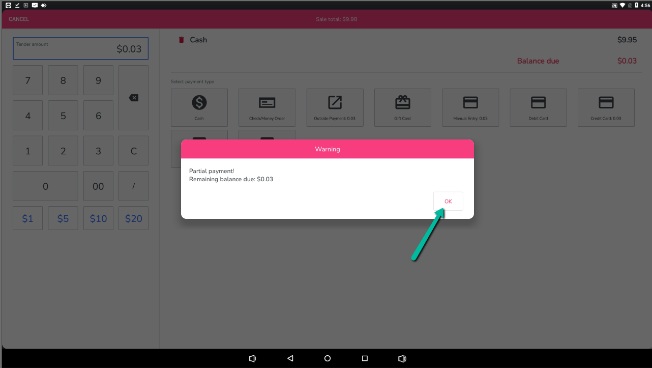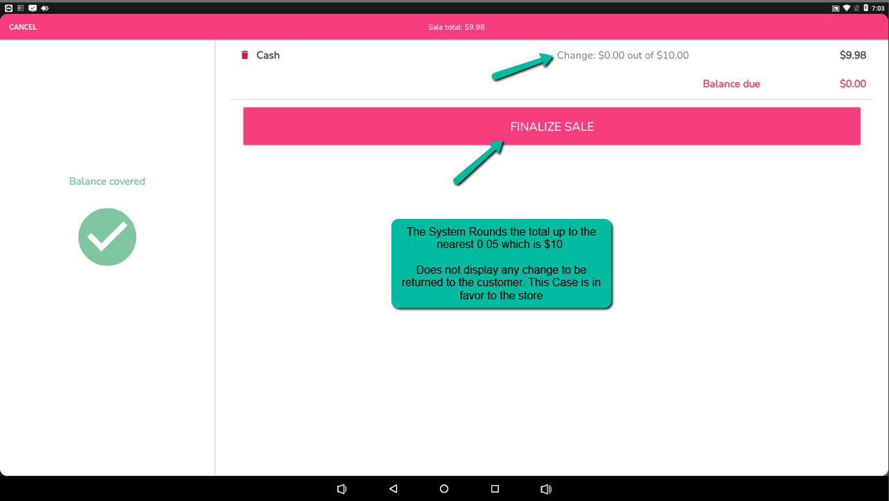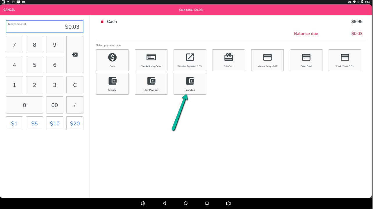 In this scenario, the system will reflect an outstanding balance of $0.03. The employee should select the Rounding payment method to adjust and complete the transaction.