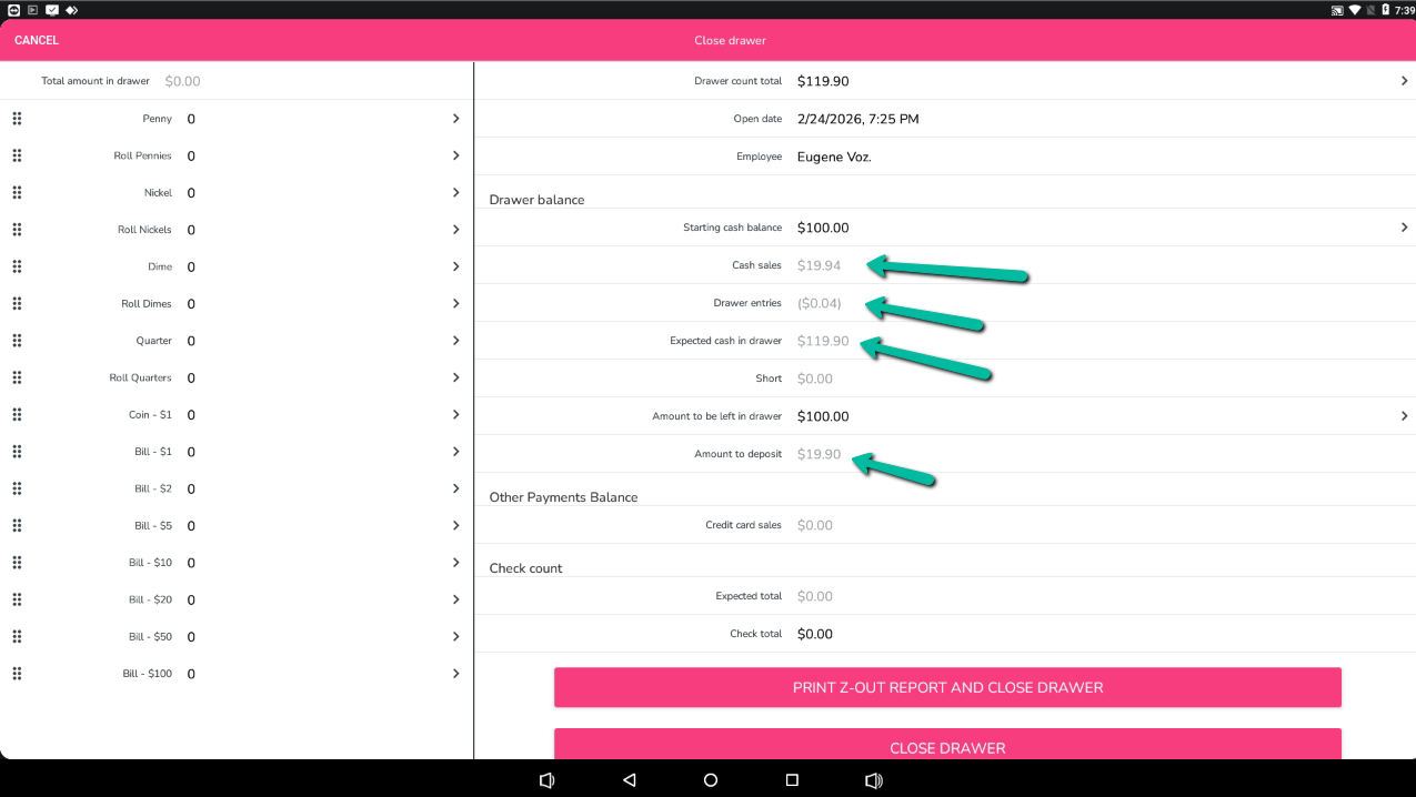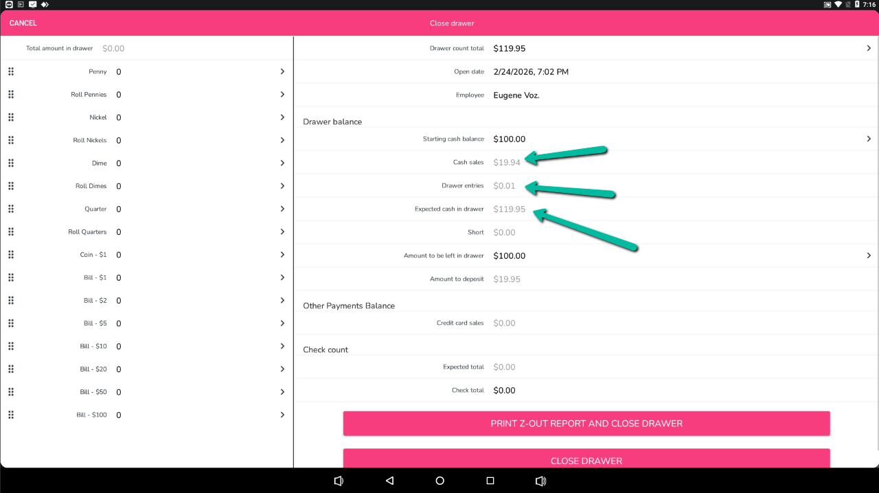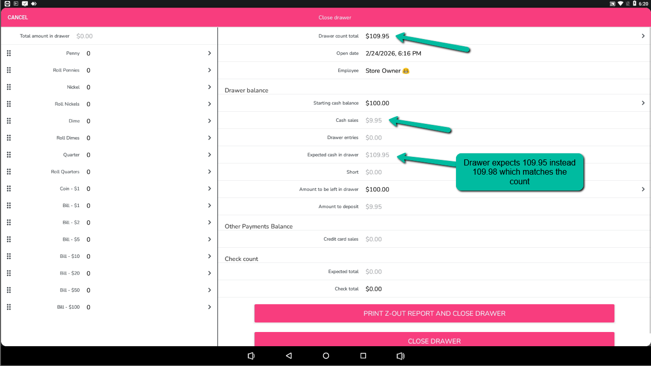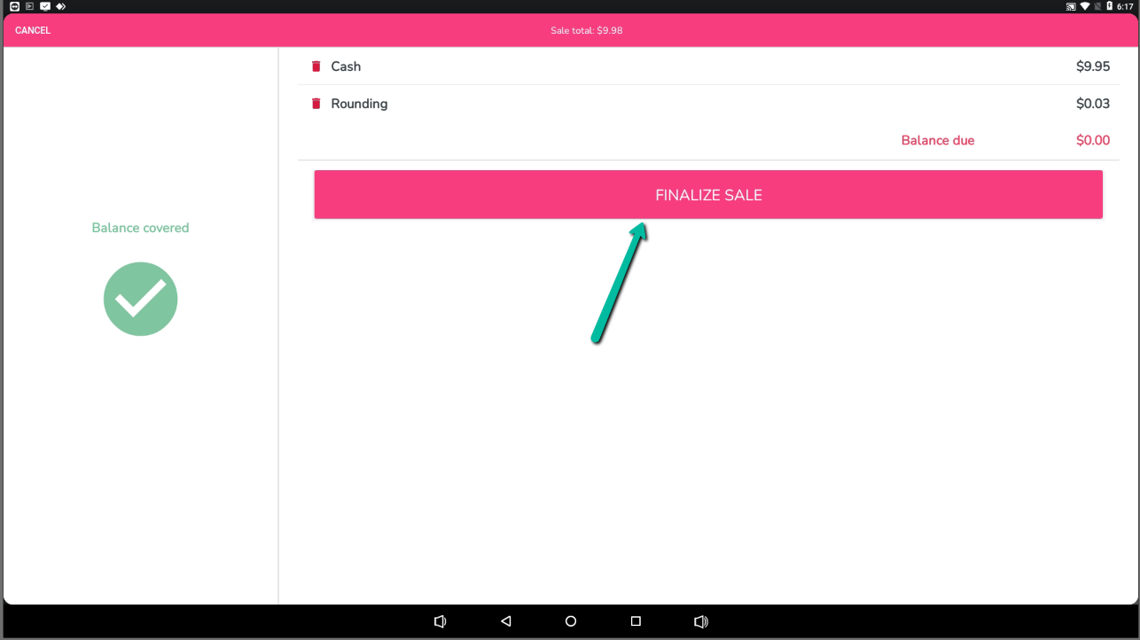 In this scenario, the system will reflect an outstanding balance of $0.03. The employee should select the Rounding payment method to adjust and complete the transaction.