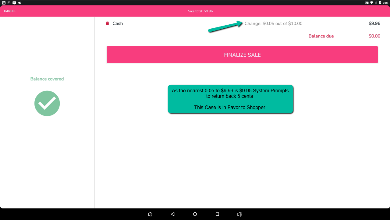 Since your store does not want to round up to the nearest $0.05, the system prompts to return $0.05 to the shopper.