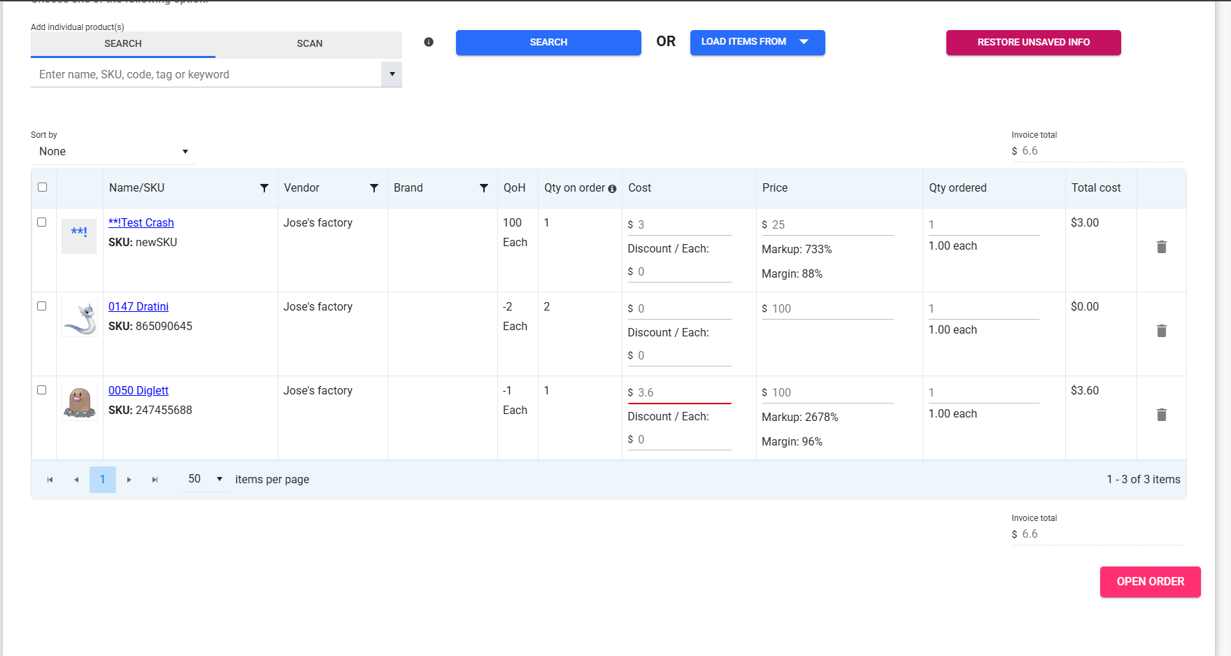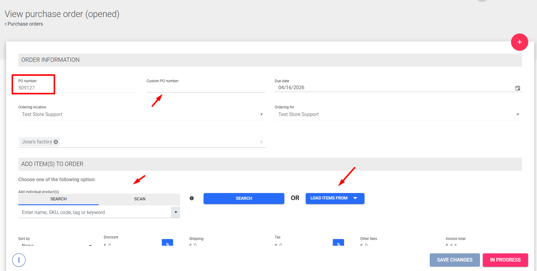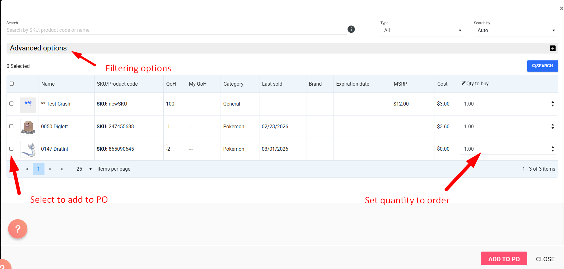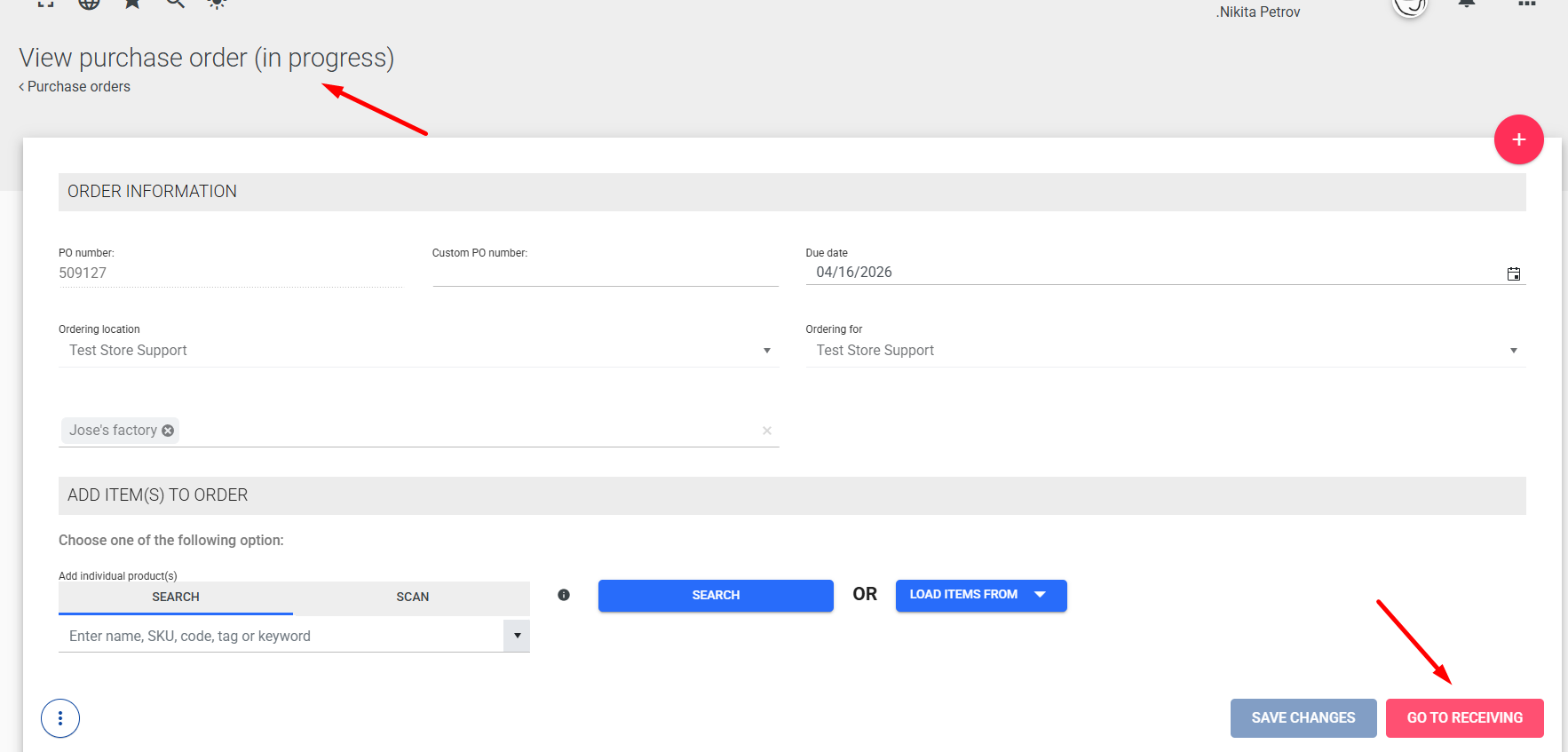 This tool can create and track both purchase orders and stock transfers to other locations. Upon receiving products with this tool, the amount will be added to on-hand quantity.