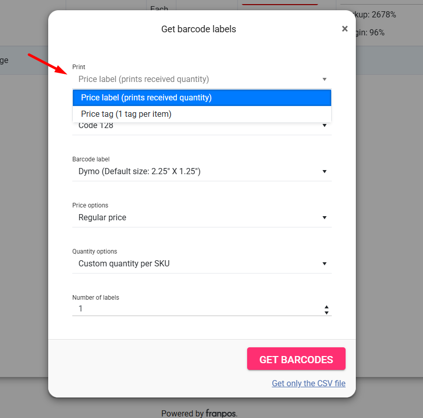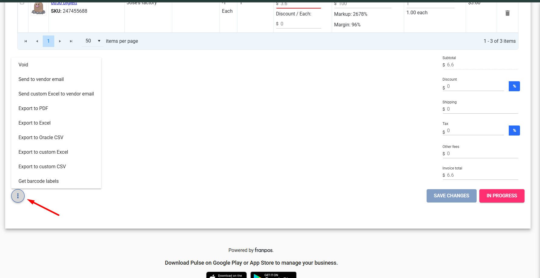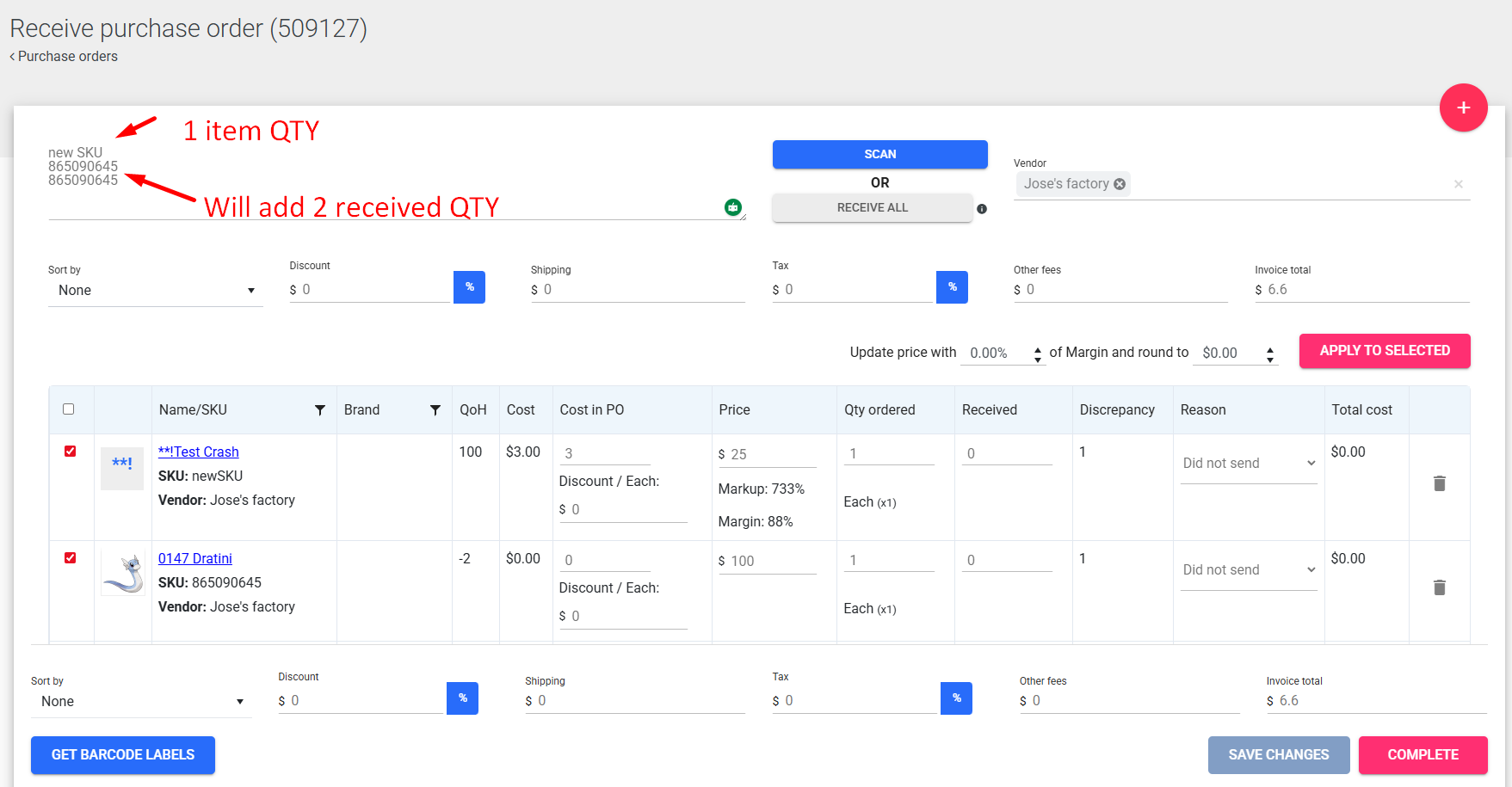 2. You can view the PO to print barcodes, delete PO or re-order same product again