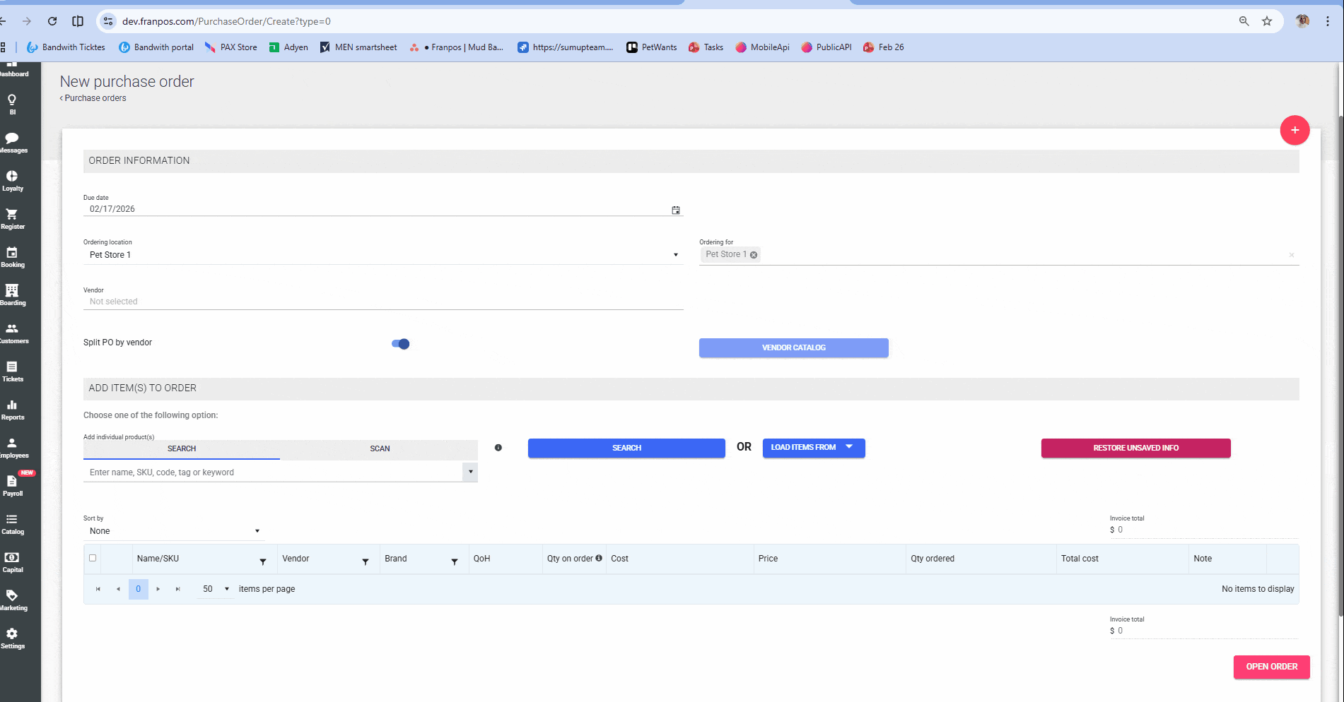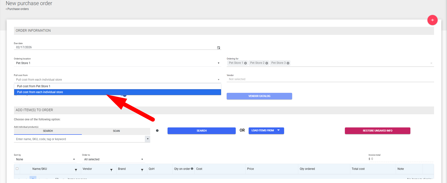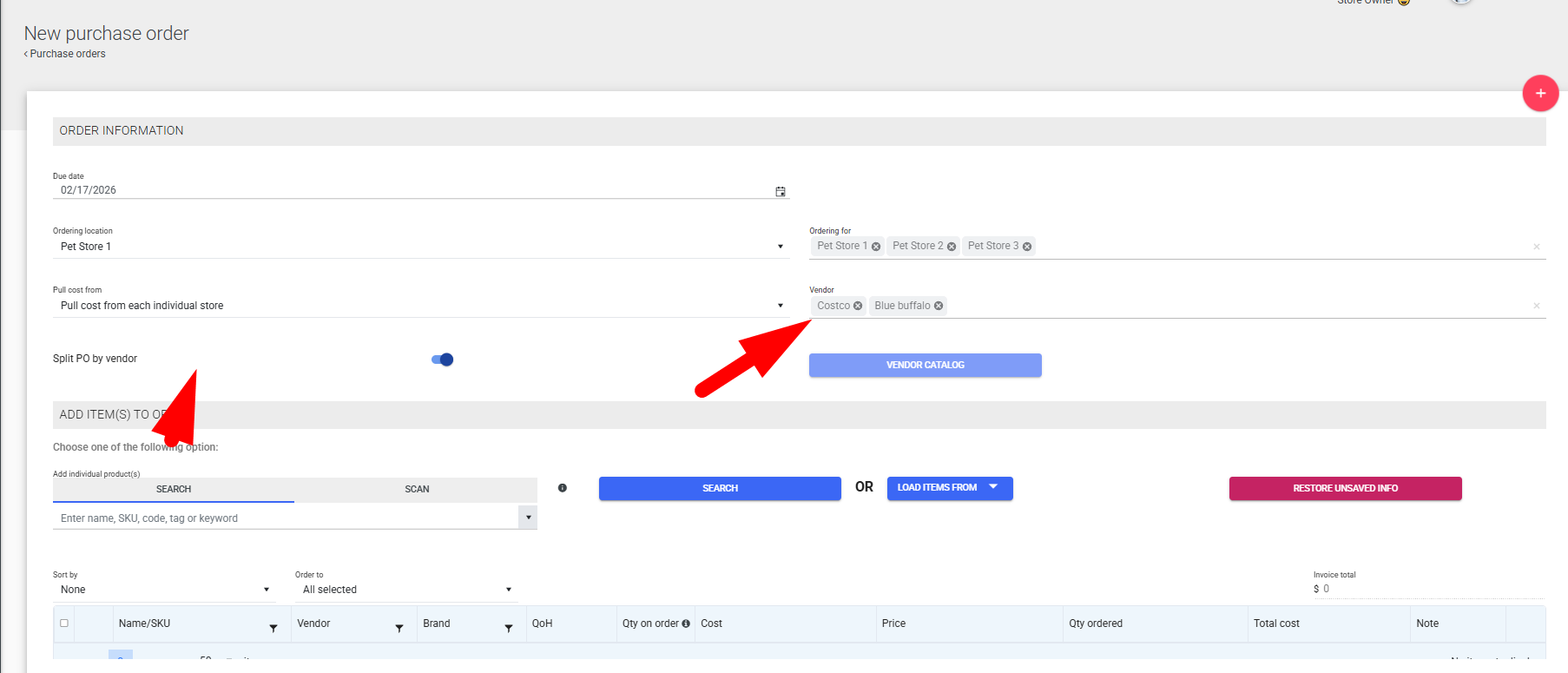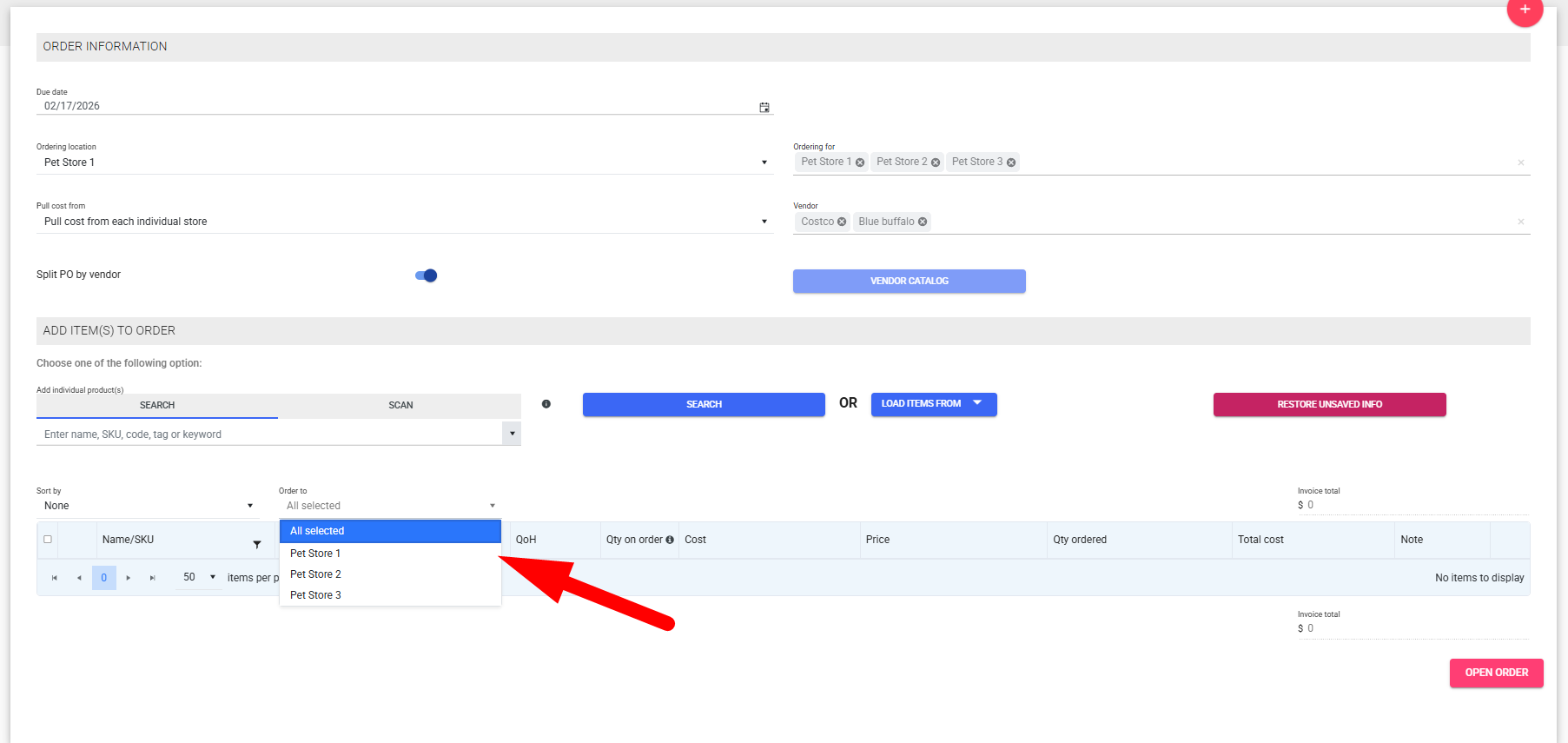Select the vendor(s) you are ordering from. In this example, we are using Costco and Blue Buffalo.