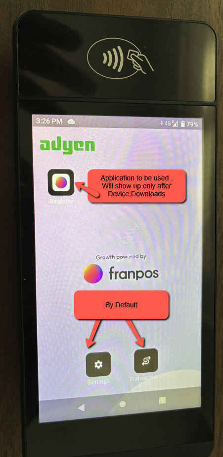The Register application will appear only after it has been downloaded to the device. This is the app that should be used for processing transactions and handling all Franpos-related operations.
