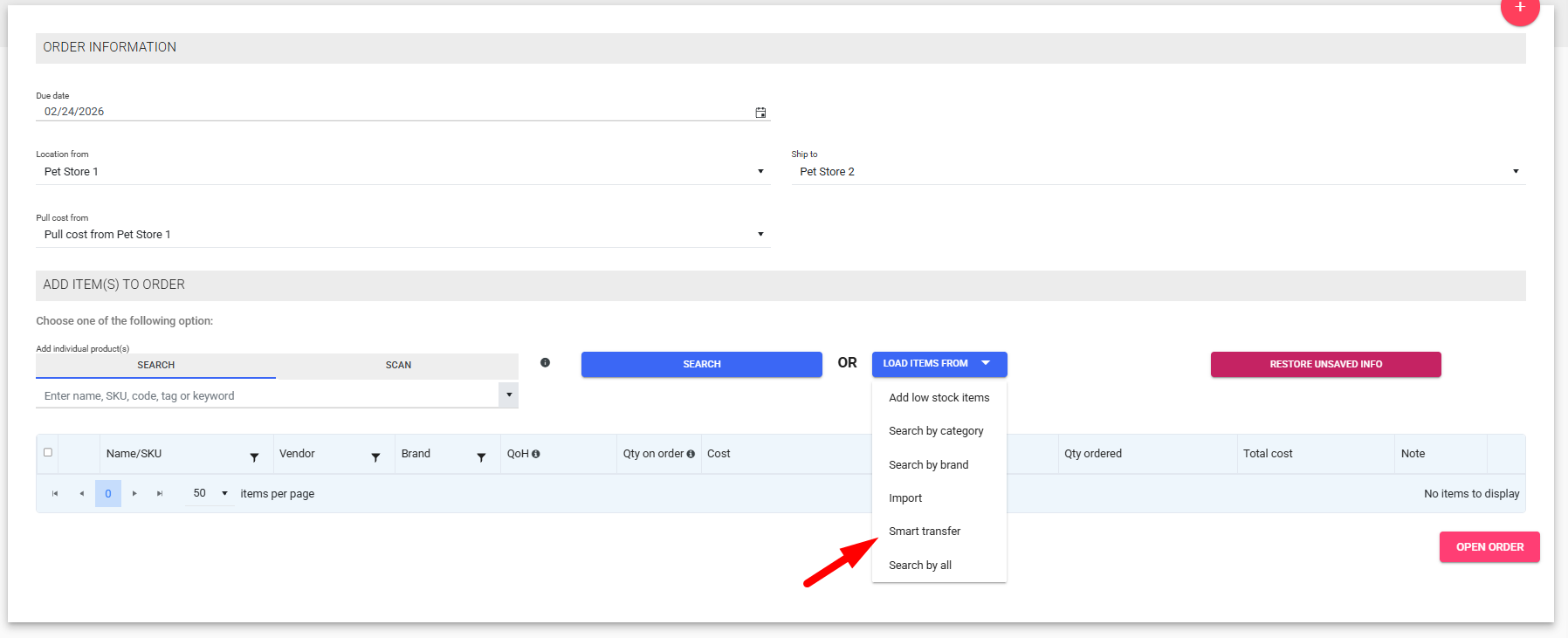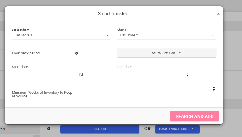 Smart Transfer calculates a recommended transfer quantity using sales velocity,
