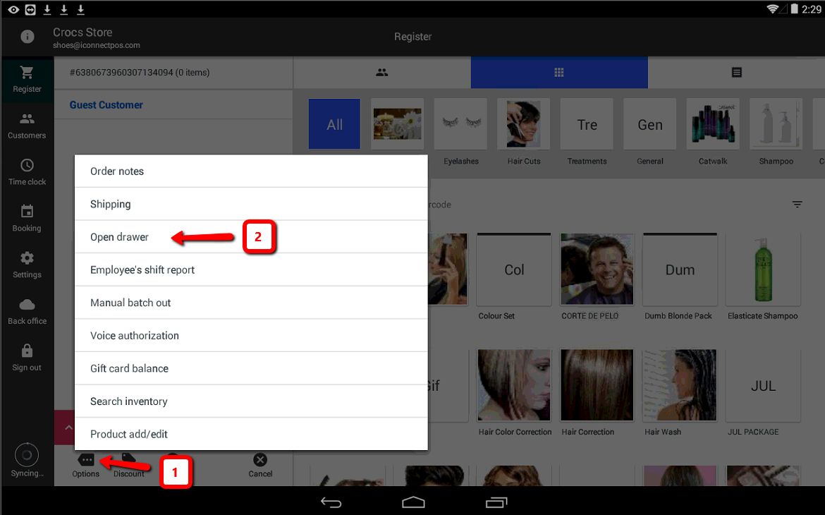 To open the drawer to start, open the context menu by tapping the "..." button near the bottom left of the main register screen.