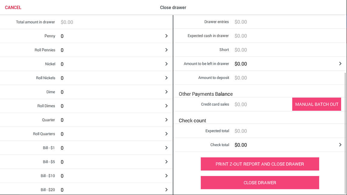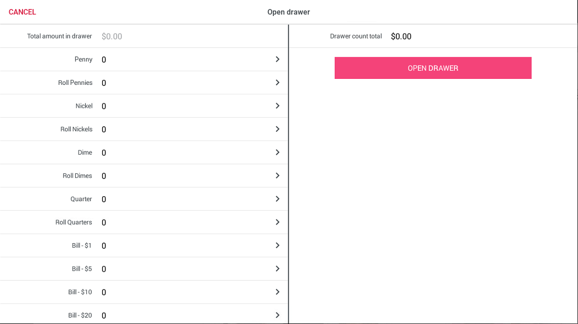 Both methods lead to the screen that allows the initial drawer count to be entered: